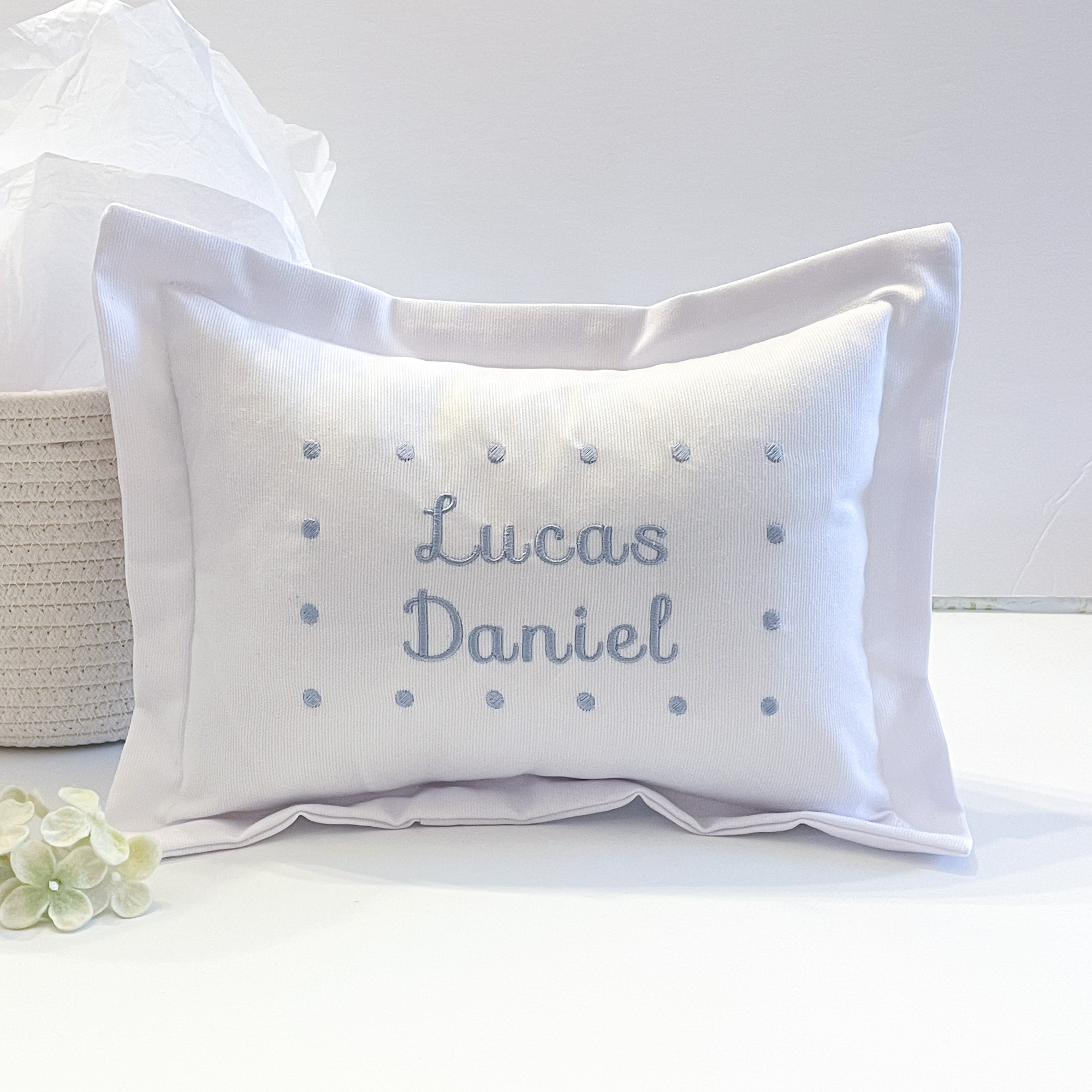 Beautiful embroidered baby pillow, ideal gift for new parents, this pillow is personalized with the baby’s name, it is a unique and special gift. If you like add the name of your personalization and I will make it for you.